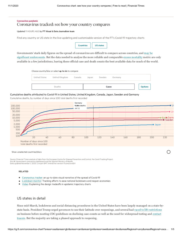 This graph illustrates unfortunately the differences in the handling of the Pandemic. When I created this I chose six industrialized nations They have a total of 346 million residents, according to Google. Also according to Google the United States has a population of 331 million residents. Five of the six nations appear on the graph below the figure for the United States. Taiwan did not have enough cases despite a population of 23.5 million to register on the bottom of the graph. So that is six industrialized nations for 77 thousand deaths versus 200 thousand deaths in the United States alone and growing at the world's fastest rate of infection. This is important to me because it illustrates the failure of our government to take the Pandemic seriously enough.