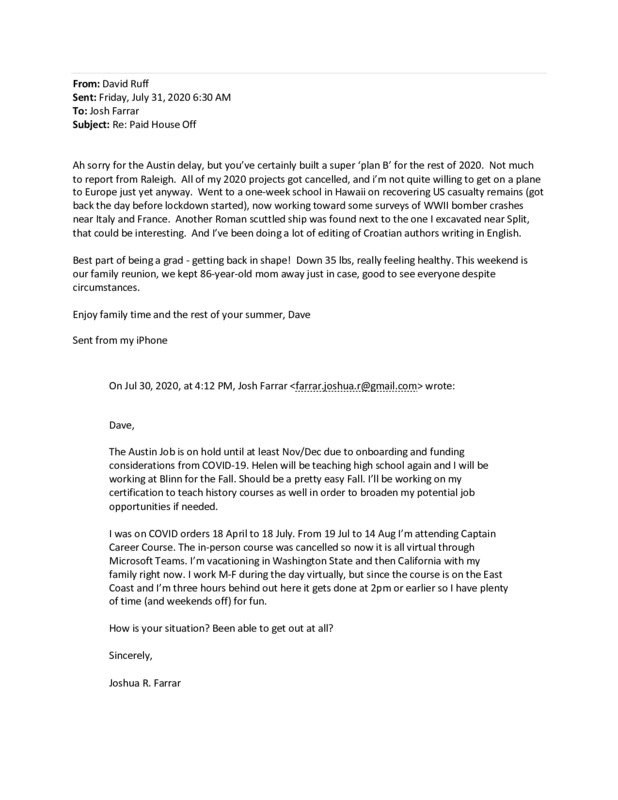 My orders were initially for 45 days but were later extended to 93 days in total. I sent updates to my supervisors as I learned new information. One update email to Dr. De Ruiter at Texas A&M University is featured in this email collection as well.
