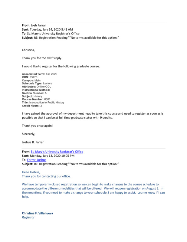 I was trying to register as a full time student with nine graduate credits, but St. Mary's had born forced to redo their entire Fall 2020 course scheduling due to COVID-19. This is described in detail in the email.