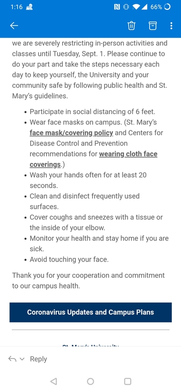 This email was one of the first ones I received from the university when I first began graduate school. It was sent by the university's President, Tom Mengler. It details the lengths the university is going to in order to protect their students, faculty and other workers. For the first few weeks of the semester there were no reported cases of COVID-19 amongst people at the school. Compared to how other universities are handling the pandemic this shows that St. Mary’s actually cares about it’s students. It made me feel a little safer knowing that the university administration is taking steps to ensure that it’s people are protected.