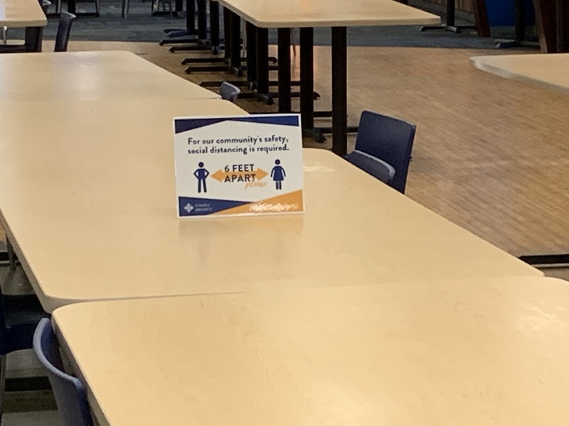 As a resident student at St. Mary's University I have eaten in the DiamondBack Cafe almost every day, and I can attest to just how different it is to eat a meal there. The seats are now all socially distanced six feet apart, and there are signs sitting on the tables and taped to the tables reminding students to keep their social distance. Along with the changes implemented because of social distancing, getting meals has also changed drastically.