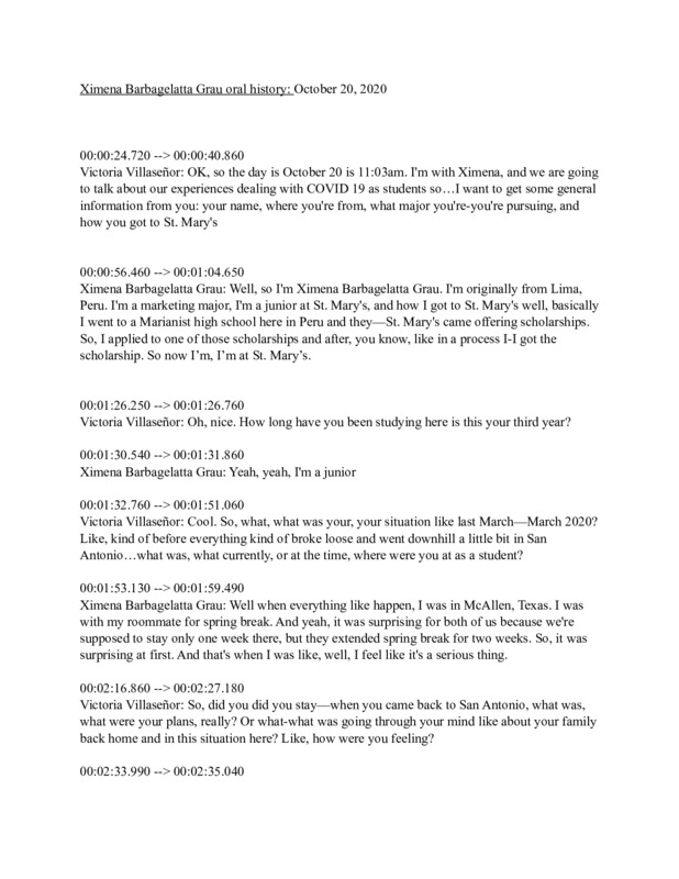 This is an oral history with Ximena Barbagelatta conducted by Victoria Villaseñor. Ximena Barbagelatta is a foreign exchange student from Lima, Peru studying at St. Mary's University in San Antonio, TX.