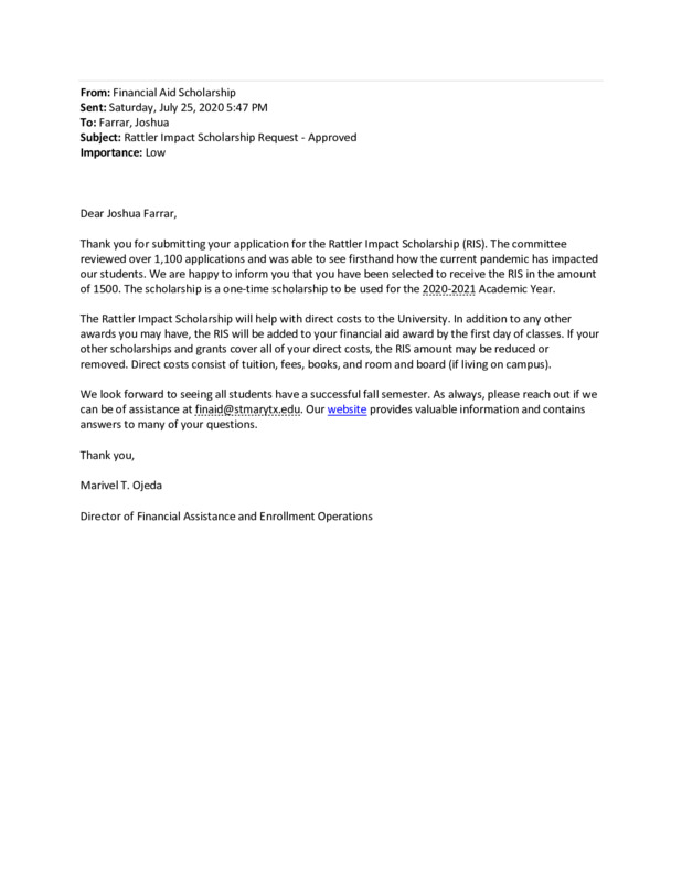 I decided to attend St. Mary's University while on the COVID-19 relief mission with the Texas Army National Guard during Summer 2020. The attached email is the email I received when I was notified that I had earned a scholarship that would lower my costs of attending graduate school. I was overwhelmed.
