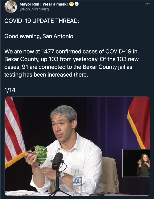 These series of images are tweets from or about San Antonio mayor Ron Nirenberg and his administration's response to the COVID-19 crisis throughout the month of May. These images illustrate the way local government mobilized to disperse political, economic, and medical information through social media.