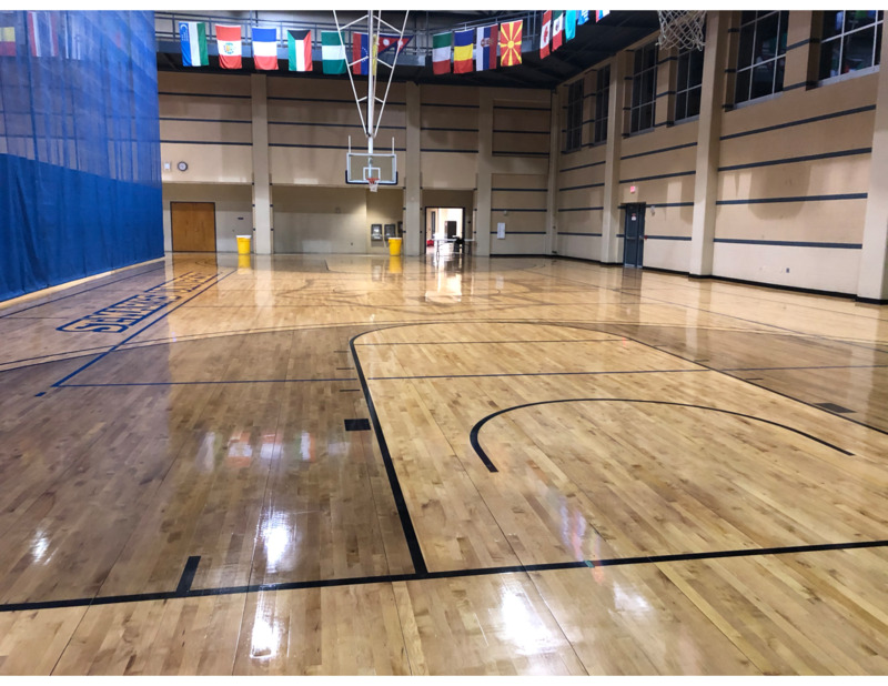 The object is a photograph of the Auxiliary Courts in the St. Mary’s University Athletics Center. To ensure the social distancing of athletes while they warm up to enter the weight room green and red tape have been placed on the courts. The first team entering the facility in the morning will use the space around the green tape and sanitize on their way out, the second group will use the red tape area to warm up and the rotation will continue.
