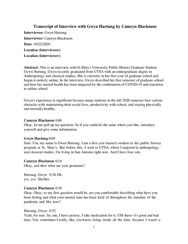 This is an interview with St.Mary's University Public History Graduate Student Gywn Hartung. Gwyn recently graduated from UTSA with an undergraduate degree in Anthropology and classical studies. She is currently in her first year of graduate school and began it entirely online. In the interview, Gwyn described her first semester of graduate school and how her mental health has been impacted by the combination of COVID-19 and transition to online school.