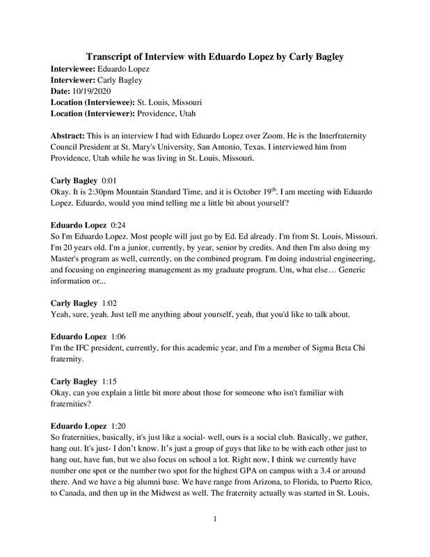 This is an interview I had with Eduardo Lopez over Zoom. He is the Interfraternity Council President at St. Mary's University, San Antonio, Texas. I interviewed him from Providence, Utah while he was living in St. Louis, Missouri.