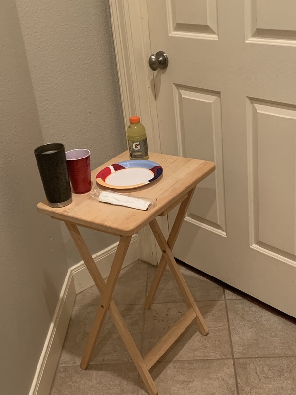 This TV table is where my mother left supplies for my father during his quarantine after he contracted COVID19 in July 2020. My mother set this table up outside their bedroom door. When she left something on the table my dad did not come and get it until she had left the hallway completely. I was not allowed to go near the table or get anything for my dad because my mom was afraid that I would get sick. She left a variety of items there for him including Gatorade and other drinks, meals, desserts, and utensils, and sticky notes. I think that this item demonstrates the type of adaptation necessary when a loved one has COVID19. My family and I could not be together, so we had to find ways to safely be apart. This table is one of the ways my parents and I did that.