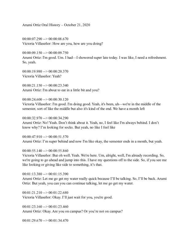 This is an oral history with Arumi Ortiz conducted by Victoria Villaseñor. Arumi was born in Veracruz, Mexico and moved to Tulsa, Oklahoma when she was 15 years old. Arumi is now a senior at St. Mary's University.