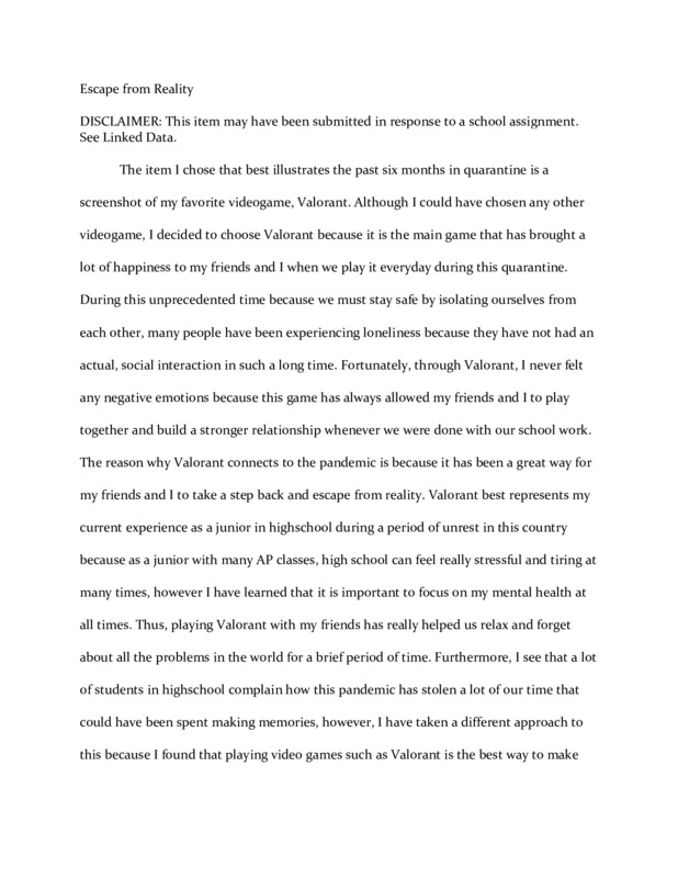 The item I chose that best illustrates the past six months in quarantine is a screenshot of my favorite videogame, Valorant. Although I could have chosen any other videogame, I decided to choose Valorant because it is the main game that has brought a lot of happiness to my friends and I when we play it everyday during this quarantine. During this unprecedented time because we must stay safe by isolating ourselves from each other, many people have been experiencing loneliness because they have not had an actual, social interaction in such a long time. Fortunately, through Valorant, I never felt any negative emotions because this game has always allowed my friends and I to play together and build a stronger relationship whenever we were done with our school work. The reason why Valorant connects to the pandemic is because it has been a great way for my friends and I to take a step back and escape from reality. Valorant best represents my current experience as a junior in highschool during a period of unrest in this country because as a junior with many AP classes, high school can feel really stressful and tiring at many times, however I have learned that it is important to focus on my mental health at all times. Thus, playing Valorant with my friends has really helped us relax and forget about all the problems in the world for a brief period of time. Furthermore, I see that a lot of students in highschool complain how this pandemic has stolen a lot of our time that could have been spent making memories, however, I have taken a different approach to this because I found that playing video games such as Valorant is the best way to make memories with friends and it has helped me realize that despite the hardships we face during this pandemic, my friends and I will always have each other’s backs.