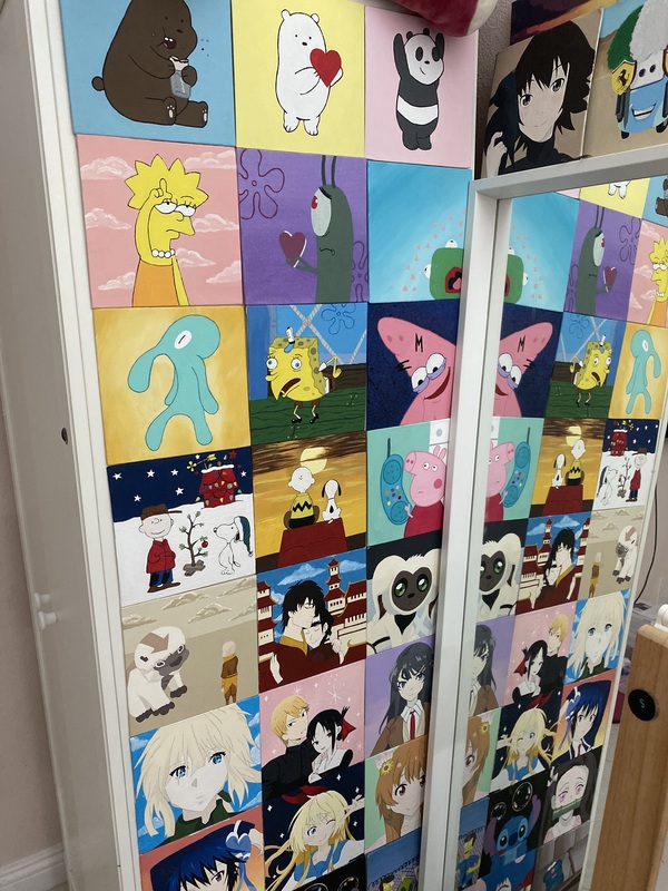 My name is Annie Nguyen and during quarantine, I have discovered my love for painting. I soon developed a talent for painting over the months and I curated this skill using the hours freed up by the pandemic. Locked indoors, I had nothing but free time. With free time to spend, I devoted all that time to painting characters from anime series and beloved movies. At first, I would display these painting on my bed mantle. However, I would soon run out of room as I painted more! Then I thought of the genius idea to assemble them as a collage on the side of my dresser. Now as I look at these painting, I am reminded of the positive of this pandemic.