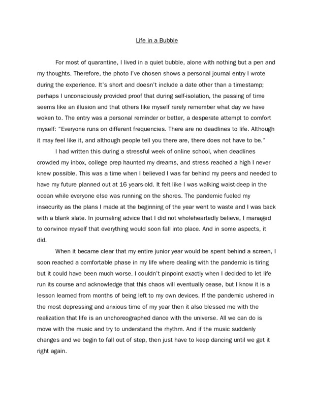 Here lies a photo of my monitor, which I believe represents my current experience as a junior in high school. Pictured on the monitor is classwork, the bane of many students going through distance learning. It connects to the pandemic as most, if not all, students are being forced to go online to complete classwork and connect to Zoom classes as we suffer through our teen years. The internet is where many have come to meet new people, find answers, and much more, which all starts through our electronic devices. Personally, my devices have kept me sane since the pandemic first struck, but also became a major source of anxiety. This miracle holds numerous games in which I can release my stress and anger through, such as Valorant and Minecraft. In addition, it allows me to communicate with my friends through Discord, something that most teens utilize. However, it is where I sit for hours starting from as early as 7:30 am, to as late as 3:00 am, just for school. This may not be the healthiest thing to do, especially since all of this occurs in my bedroom, a place that used to be my haven. What was initially my safe space became a source of a multitude of emotions, such as stress, anger, joy, and much more. There is no longer a true feeling of comfort in any place I can think of, which really is the most disappointing part of it all. But, it’s just part of being a quarantined teen, right? During this quarantine, I believe I have changed for the better in most aspects, though my mental health has reached the lowest point it has ever gone. I’ve made so many new friends, something that I believe is somewhat hard for me, so I consider it a significant accomplishment. Most importantly, I have learned to prioritize myself. Although I’m not quite there yet, big decisions take baby steps, and thanks to it, I feel like I’m slowly getting better mentally. Unfortunately, I have also lost and drifted from friends, and lost a few people in my life due to the virus. As much as I want to feel sorry for myself, to just cry and complain about the unfairness of life, almost everyone is going through something due to the pandemic, so the best I can do is to stay silent and keep on pushing.