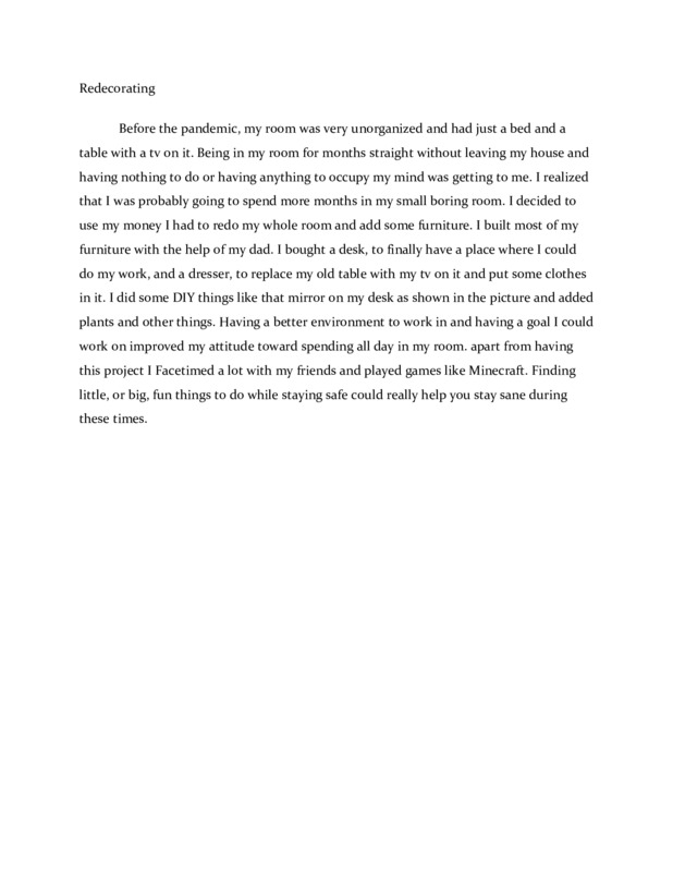 Before the pandemic, my room was very unorganized and had just a bed and a table with a tv on it. Being in my room for months straight without leaving my house and having nothing to do or having anything to occupy my mind was getting to me. I realized that I was probably going to spend more months in my small boring room. I decided to use my money I had to redo my whole room and add some furniture. I built most of my furniture with the help of my dad. I bought a desk, to finally have a place where I could do my work, and a dresser, to replace my old table with my tv on it and put some clothes in it. I did some DIY things like that mirror on my desk as shown in the picture and added plants and other things. Having a better environment to work in and having a goal I could work on improved my attitude toward spending all day in my room. apart from having this project I Facetimed a lot with my friends and played games like Minecraft. Finding little, or big, fun things to do while staying safe could really help you stay sane during these times.