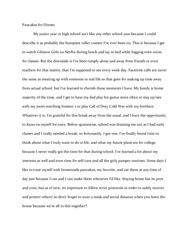 My junior year in high school isn't like any other school year because I could describe it as probably the bumpiest roller coaster I've ever been on. This is because I get to watch Gilmore Girls on Netflix during lunch and lay in bed while logging onto zoom for classes. But the downside is I've been simply alone and away from friends or even teachers for that matter, that I'm supposed to see every week day. Facetime calls are never the same as meeting up with someone in real life so that goes for making up time away from actual school, but I've learned to cherish these moments I have. My family is home majority of the time, and I get to hear my dad play his guitar more often or stay up late with my mom watching Sinister 2 or play Call of Duty Cold War with my brothers. Whatever it is, I'm grateful for this break away from the usual, and I have the opportunity to focus on myself for once. Before quarantine, school was draining me out as I had early classes and I really needed a break, so fortunately, I got one. I've finally found time to think about what I truly want to do in life, and what my future plans are for college because I never really got the time for that during school. I've learned a lot about my interests as well and even time for self-care and all the girly pamper routines. Some days I like to treat myself with homemade pancakes, my favorite, and eat them at any time of day just because I can and I can make them whenever I'd like. Staying home has its pros and cons, but as of now, its important to follow strict protocols in order to safely recover and protect others! so don't forget to wear a mask and social distance when you leave the house because we're all in this together!!
