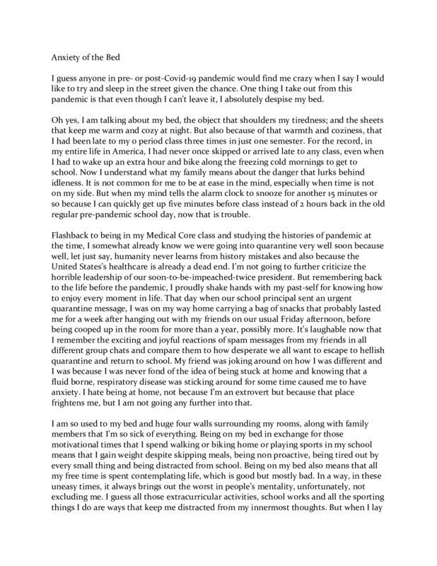 Oh yes, I am talking about my bed, the object that shoulders my tiredness; and the sheets that keep me warm and cozy at night. But also because of that warmth and coziness, that I had been late to my 0 period class three times in just one semester. For the record, in my entire life in America, I had never once skipped or arrived late to any class, even when I had to wake up an extra hour and bike along the freezing cold mornings to get to school. Now I understand what my family means about the danger that lurks behind idleness. It is not common for me to be at ease in the mind, especially when time is not on my side. But when my mind tells the alarm clock to snooze for another 15 minutes or so because I can quickly get up five minutes before class instead of 2 hours back in the old regular pre-pandemic school day, now that is trouble.