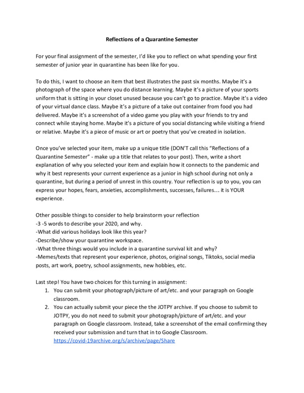 This is the assignment given to my high school juniors at GGHS in Southern California to reflect on their semester of quarantine. Assignments with the #gghsapush and #GGHS hashtags should be related to this assignment. GGHS serves approximately 2400 students, and has an approximate demographic breakdown of: 50% Latino, 39% Asian, 7% White, and 4% other. 66% of the student body is identified as socio-economically disadvantaged, and 23% are identified as English Learners. The school has been on Distance Learning since March 16, 2020.
