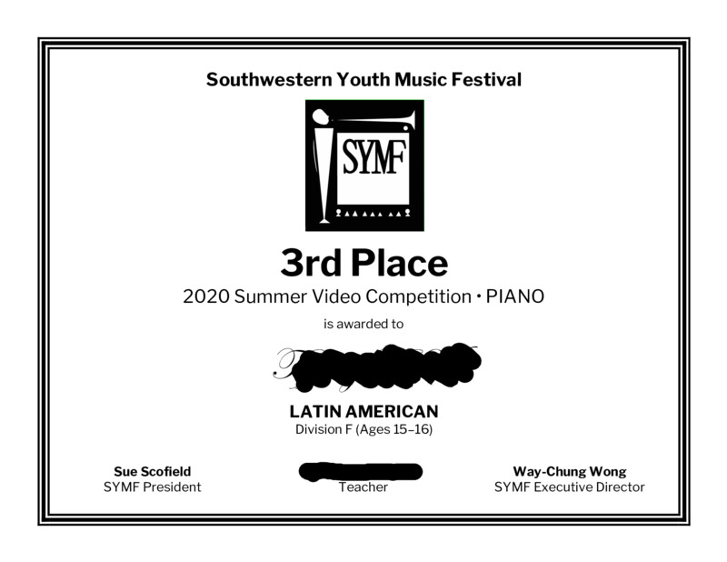 This is a pdf of my award from the annual piano competition. Usually, I would perform in a concert hall with 3 judges and the other contestants. This year, I had to submit my recordings and compete with over 30 entrees. To me, my piano was not the big grand pianos and my setup was not professional as others. After changing songs a month before the due date, I practiced for hours. You think learning an 8-page song in a month is hard, but actually, it was fun with the pressure on. 3 months after submitting, I finally got the news that I won 3rd place. Despite learning a song in a month, I was able to win and place. From this, I learned that hard work never stops and nothing should discourage you. If I gave up when I found out the category I originally applied for was canceled, I wouldn't have won. This was an important event for me because I didn't think I would get close since I was close on time. If I turned back time, I would have initially picked this set of songs and perfected it, even before the quarantine.