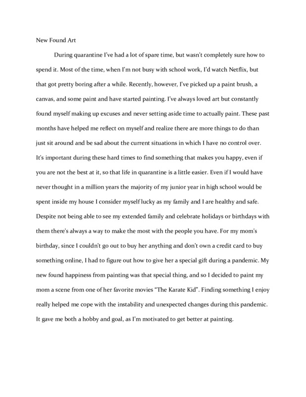 During quarantine I’ve had a lot of spare time, but wasn't completely sure how to spend it. Most of the time, when I’m not busy with school work, I’d watch Netflix, but that got pretty boring after a while. Recently, however, I’ve picked up a paint brush, a canvas, and some paint and have started painting. I’ve always loved art but constantly found myself making up excuses and never setting aside time to actually paint. These past months have helped me reflect on myself and realize there are more things to do than just sit around and be sad about the current situations in which I have no control over. It's important during these hard times to find something that makes you happy, even if you are not the best at it, so that life in quarantine is a little easier. Even if I would have never thought in a million years the majority of my junior year in high school would be spent inside my house I consider myself lucky as my family and I are healthy and safe. Despite not being able to see my extended family and celebrate holidays or birthdays with them there's always a way to make the most with the people you have. For my mom's birthday, since I couldn’t go out to buy her anything and don’t own a credit card to buy something online, I had to figure out how to give her a special gift during a pandemic. My new found happiness from painting was that special thing, and so I decided to paint my mom a scene from one of her favorite movies “The Karate Kid”. Finding something I enjoy really helped me cope with the instability and unexpected changes during this pandemic. It gave me both a hobby and goal, as I’m motivated to get better at painting.