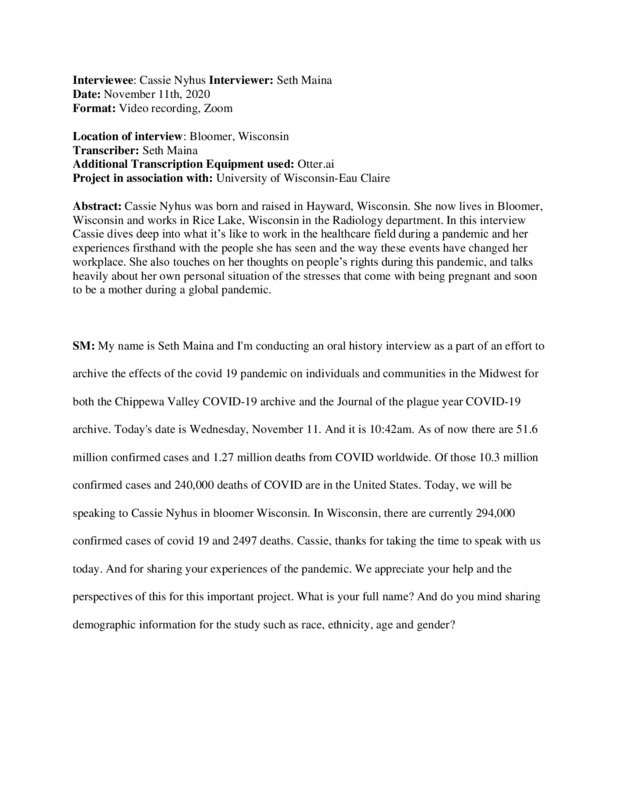 Cassie Nyhus was born and raised in Hayward, Wisconsin. She now lives in Bloomer, Wisconsin and works in Rice Lake, Wisconsin in the Radiology department. In this interview Cassie dives deep into what it’s like to work in the healthcare field during a pandemic and her experiences firsthand with the people she has seen and the way these events have changed her workplace. She also touches on her thoughts on people’s rights during this pandemic, and talks heavily about her own personal situation of the stresses that come with being pregnant and soon to be a mother during a global pandemic.