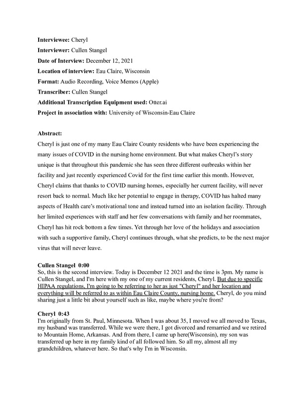 Cheryl is just one of my many Eau Claire County residents who have been experiencing the many issues of COVID in the nursing home environment. But what makes Cheryl’s story unique is that throughout this pandemic she has seen three different outbreaks within her facility and just recently experienced Covid for the first time earlier this month. However, Cheryl claims that thanks to COVID nursing homes, especially her current facility, will never resort back to normal. Much like her potential to engage in therapy, COVID has halted many aspects of Health care’s motivational tone and instead turned into an isolation facility. Through her limited experiences with staff and her few conversations with family and her roommates, Cheryl has hit rock bottom a few times. Yet through her love of the holidays and association with such a supportive family, Cheryl continues through, what she predicts, to be the next major virus that will never leave.