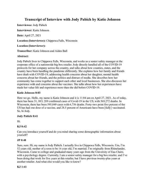 Jody Pabich lives in Chippewa Falls, Wisconsin, and works as a senior safety manager at the corporate office of a nationwide big box retailer. Jody directly handled all of the COVID-19 protocols for her company across the country, and talks about how counties, states, and the country have been handling the pandemic differently. She explains how her family and friends have dealt with COVID-19, addressing health concerns about her daughter, mental health concerns about her friends, and the politics and distrust of media. She describes how her community has come together to support each other and local businesses. She also discusses her experience with and concerns about the vaccines. She talks about how her experiences have made her value life and experience more than she did before COVID-19.