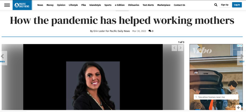 This is an opinion piece by Erin Loder for the Pacific Daily News. This opinion piece details the benefits that COVID-19 has brought for working mothers. Loder, a working mother herself, describes having a more flexible schedule to help take care of kids. She says that in the workforce, women often get penalized for having kids much more often than men do, and with working from home, she is allowed to take more time for her kids and save money by not having to pay for daycare as often. Overall, she sees this as a positive turn for working mothers, since the pandemic has given women opportunities to raise their families more as they work. I found this opinion piece a nice take, as it brings out some of the positives women have experienced due to changes having to be made in work-life balance for many people out there.