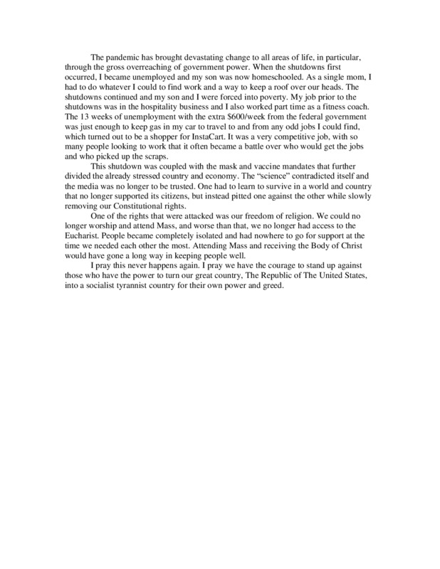 I got married on April 4, 2020. We had planned 125 guests. I was so excited to celebrate with everyone. I remember hearing about covid in China in February and thinking that it was so far away I shouldn't worry. While my daughter was on Spring break everything started shutting down. At first it seemed temporary. Like it would just be a week or two. Just until things died down. Then local governments started getting strict as it became apparent how dangerous covid was. As the rules changed, I had to send apologetic emails disinviting guests due to limits on gatherings. We went from 125 to 100. Then it went to 75, 50, and 25. Each time it was agonizing figuring out who would be cut from our wedding. Finally it came down to just our parents, the pastor and his family, and the photographer. I got my wedding dress back from alterations the day the shop closed down to the public. We had the wedding in my parents' backyard. The pastor's children played guitar and sang. Our honeymoon was canceled a few days before the wedding because the small county in the mountains wasn't letting anyone in who wasn't local. We had a staycation for a honeymoon and played video games together.