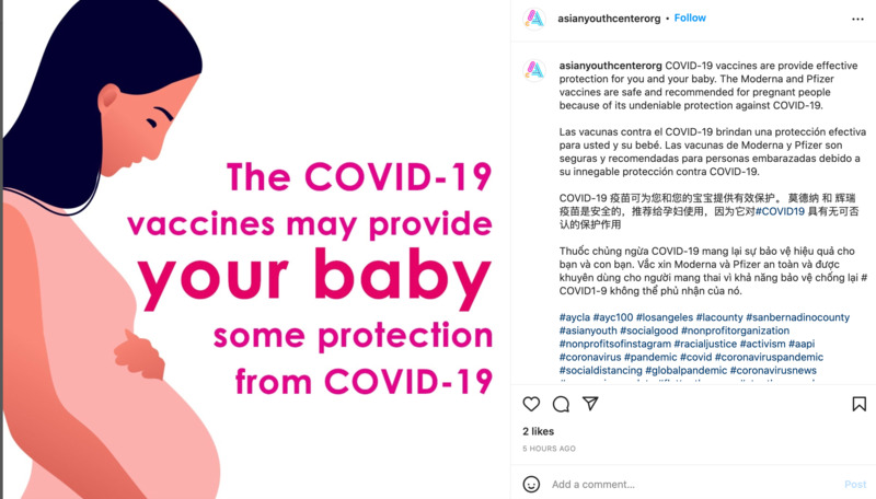 This is an Instagram post by asianyouthcenterorg. This post is giving information on vaccinations and pregnancy. It says that Pfizer and Moderna are the most recommended vaccines for expecting mothers.