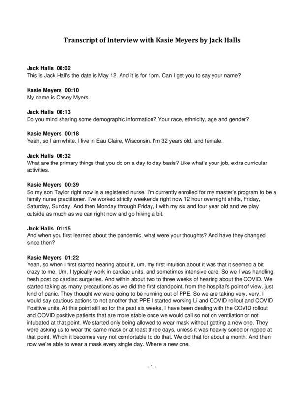 Interview with Kasie Meyers by Jack Halls. In this interview, Kasie Meyers discusses how COVID has impacted her role as a nurse and the changes she and her colleagues face. She also discusses her journey as a student and how covid has impacted her studies, she touches on her role as a mother and the difficulties that have been heightened because of the pandemic. She expresses how her relationships with friends and family have changed and also discusses her view on the government and its handling of the pandemic.