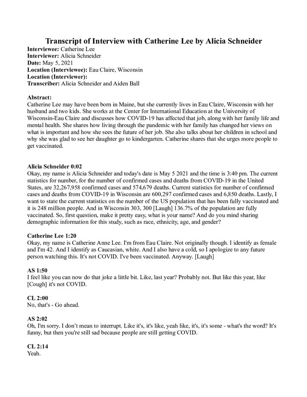 Catherine Lee may have been born in Maine, but she currently lives in Eau Claire, Wisconsin with her husband and two kids. She works at the Center for International Education at the University of Wisconsin-Eau Claire and discusses how COVID-19 has affected that job, along with her family life and mental health. She shares how living through the pandemic with her family has changed her views on what is important and how she sees the future of her job. She also talks about her children in school and why she was glad to see her daughter go to kindergarten. Catherine shares that she urges more people to get vaccinated.