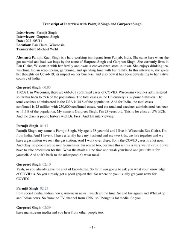 Parmjit Kaur Singh is a hard-working immigrant from Punjab, India. She came here when she got married and had two boys by the name of Harpreet Singh and Gurpreet Singh. She currently lives in Eau Claire, Wisconsin with her family and owns a convenience store in town. She enjoys drinking tea, watching Indian soap operas, gardening, and spending time with her family. In this interview, she gives her thoughts on Covid-19, its impact on her business, and also how it has been devastating to her native country of India.