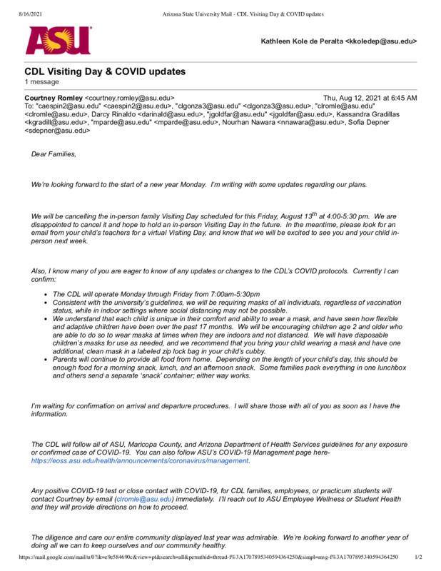 Today, after 2 weeks without daycare, ASU reopened its daycare on campus. I dropped my son off at the CDL daycare this morning, and all the kids are now required to wear a mask. This was not a big deal, because I won't let my son go grocery shopping with me unless he wears a mask, he sees his older sister wearing a mask, so the process is normalized.