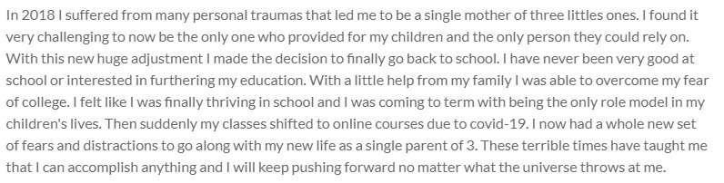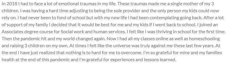 In 2018 I suffered from many personal traumas that led me to be a single mother of three littles ones. I found it very challenging to now be the only one who provided for my children and the only person they could rely on. With this new huge adjustment I made the decision to finally go back to school. I have never been very good at school or interested in furthering my education. With a little help from my family I was able to overcome my fear of college. I felt like I was finally thriving in school and I was coming to term with being the only role model in my children's lives. Then suddenly my classes shifted to online courses due to covid-19. I now had a whole new set of fears and distractions to go along with my new life as a single parent of 3. These terrible times have taught me that I can accomplish anything and I will keep pushing forward no matter what the universe throws at me.