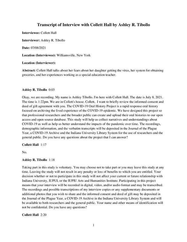 Collett Hall talks about her fears about her daughter getting the virus, her system for obtaining groceries, and her experiences working as a special education teacher.