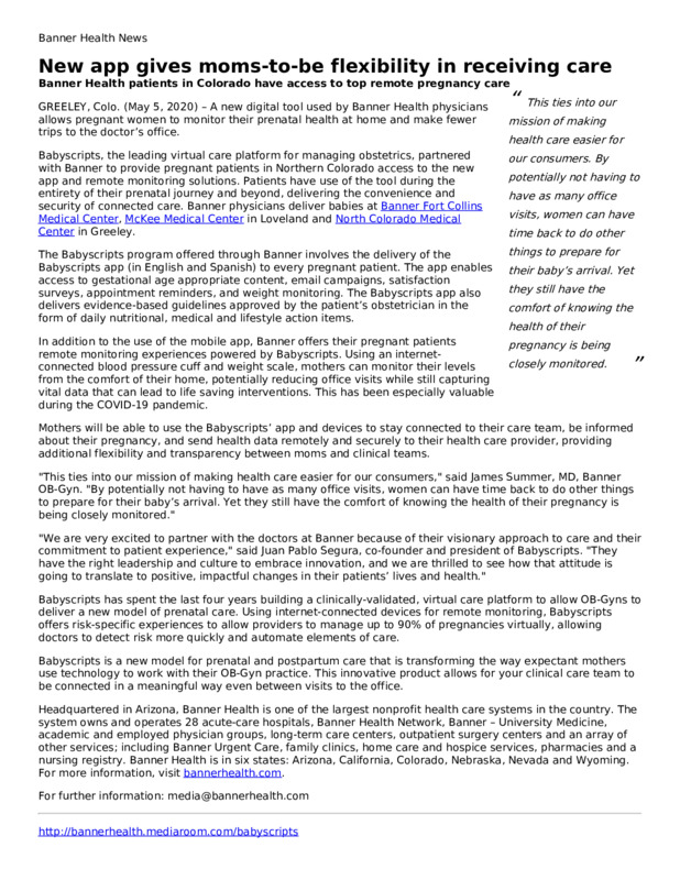A press release from Banner Health announcing a new digital tool used by Banner Health physicians allows pregnant women to monitor their prenatal health at home and make fewer trips to the doctor’s office.