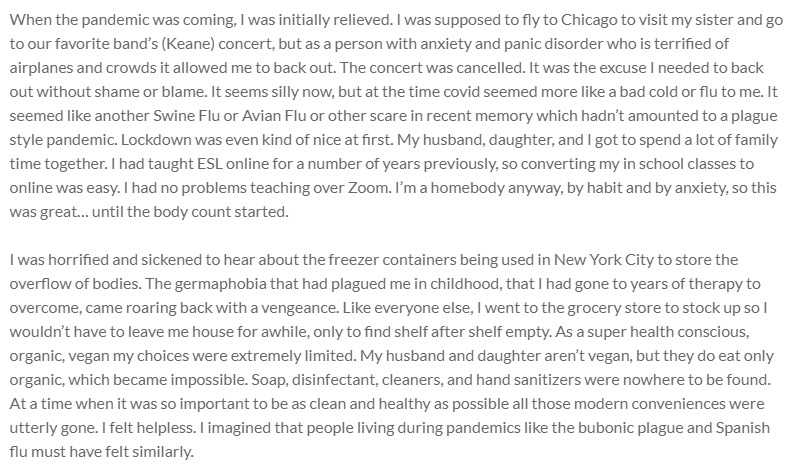 When the pandemic was coming, I was initially relieved. I was supposed to fly to Chicago to visit my sister and go to our favorite band’s (Keane) concert, but as a person with anxiety and panic disorder who is terrified of airplanes and crowds it allowed me to back out. The concert was cancelled. It was the excuse I needed to back out without shame or blame. It seems silly now, but at the time covid seemed more like a bad cold or flu to me. It seemed like another Swine Flu or Avian Flu or other scare in recent memory which hadn’t amounted to a plague style pandemic. Lockdown was even kind of nice at first. My husband, daughter, and I got to spend a lot of family time together. I had taught ESL online for a number of years previously, so converting my in school classes to online was easy. I had no problems teaching over Zoom. I’m a homebody anyway, by habit and by anxiety, so this was great… until the body count started.