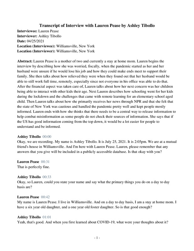 Ashley Tibollo interviewed stay-at-home mom, Lauren Pease about her experience with the Covid-19 pandemic. In this interview, they discuss her experience with the lockdown, her worries about the pandemic, and what life was like during lockdown with her foster child. This interview also touches on political protests, virtual learning and her husband's transition to working from home.