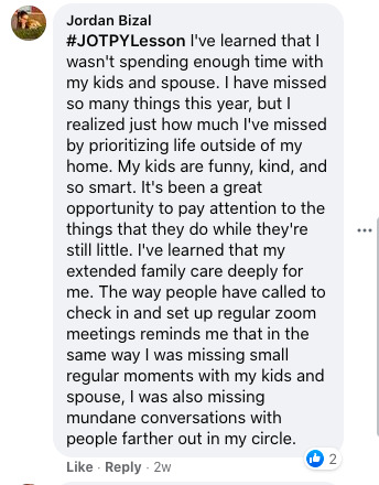 I've learned that I wasn't spending enough time with my kids and spouse. I have missed so many things this year, but I realized just how much I've missed by prioritizing life outside of my home. My kids are funny, kind, and so smart. It's been a great opportunity to pay attention to the things that they do while they're still little. I've learned that my extended family care deeply for me. The way people have called to check in and set up regular zoom meetings reminds me that in the same way I was missing small regular moments with my kids and spouse, I was also missing mundane conversations with people farther out in my circle.