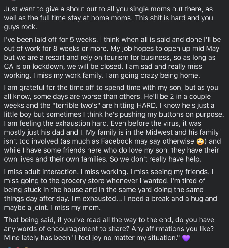 I am researching the unintended consequences of the pandemic. One way to find some answers is to learn what real people are going through. It is easy to find people’s thoughts about the pandemic on social media, so I took to my mom groups and found people willing to let me share their thoughts anonymously. In the first screenshot, a mom talks about how she is trying to stay positive through the pandemic. From losing her job temporarily, to missing her work and family, to missing simple everyday things like shopping, this mom is feeling the brunt of lockdown in California. It is easy to pick out the negative consequences of the pandemic, but she looks for positivity anyway.