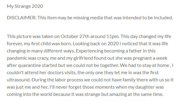 This picture was taken on October 27th around 11pm. This day changed my life forever, my first child was born. Looking back on 2020 I noticed that it was life changing in many different ways. Experiencing becoming a father in this pandemic was crazy, me and my girlfriend found out she was pregnant a week after quarantine started but we could not be together. We had to stay at home , I couldn't attend her doctors visits, the only one they let me in was the first ultrasound. During the labor process we could not have family there with us so it was just me and her. I'll never forget those moments when my daughter was coming into the world because it was strange but amazing at the same time.