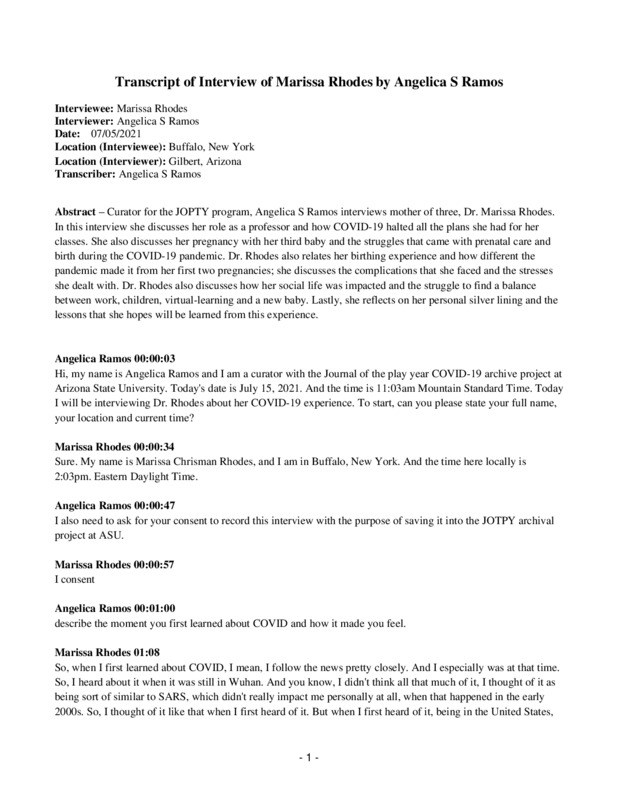 Curator for the JOPTY program, Angelica S Ramos interviews mother of three, Dr. Marissa Rhodes. In this interview she discusses her role as a professor and how COVID-19 halted all the plans she had for her classes. She also discusses her pregnancy with her third baby and the struggles that came with prenatal care and birth during the COVID-19 pandemic. Dr. Rhodes also relates her birthing experience and how different the pandemic made it from her first two pregnancies; she discusses the complications that she faced and the stresses she dealt with. Dr. Rhodes also discusses how her social life was impacted and the struggle to find a balance between work, children, virtual-learning and a new baby. Lastly, she reflects on her personal silver lining and the lessons that she hopes will be learned from this experience.
