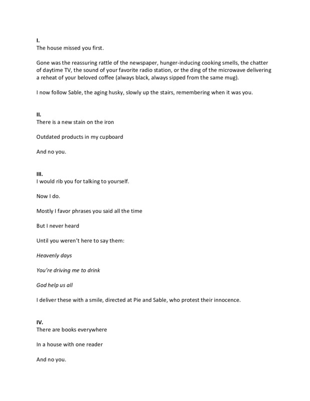 My mom died of COVID-19 last July when her nursing home in Atlanta was overrun with the virus. Before that, she lived with me, my dog, and cat. The way she lived in the house made it truly a home for us. I am a workaholic, often using the house for a fast supper and some sleep before starting all over the next day, sprinting back to work. The poem is our way of telling her how much she is missed.