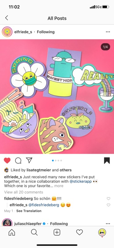 Elfriede_s created a collaborative sticker set that represents aspects of quarantine and the pandemic. It potrays a spring flower wearing a face mask, a cactus in his pot lables sweet home, 'a dose of reality' cocktail and so. one