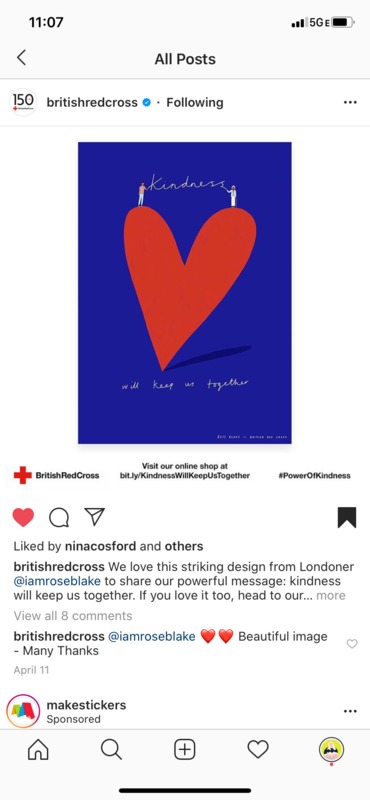 The British red cross used a graphic digital poster of a large heart with an old and a young person holding the word kindness from a distance, this represents the social distancing that has been mandated as necessary but the connection power of kindness during this period. This image is different than the typical post by large format non profits, they have been a majority informative and education based posts.