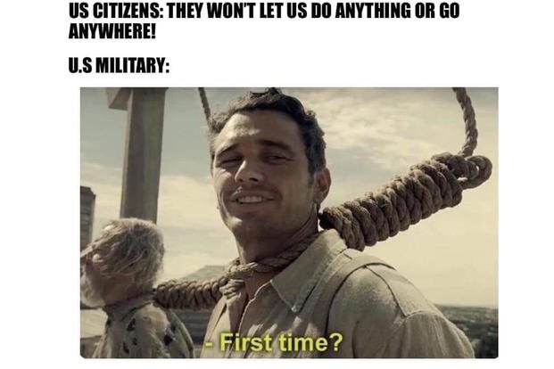 I thought it would be important to post a Military meme as they are usually what is considered the 'front line'. It is a niche community but still very broad. I think this meme emphasizes the freedom we take for granted but are beginning to realize as quarantine is deepened. This is something the Military is more accustomed to.