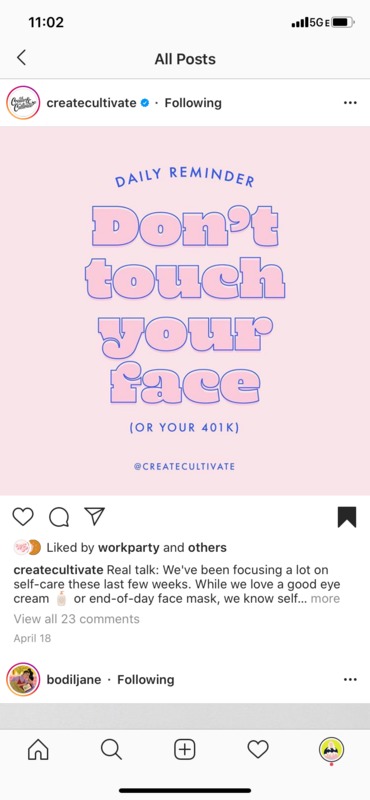 "Daily Reminder, Don't touch your face, (or your 401k)" this post is a common more light hearted psa that encourages against the touching of your face as it spreads the virus. The post then goes too expose the economic desperation many are feeling during this time of lost jobs, increased healthcare bills and various other struggles.