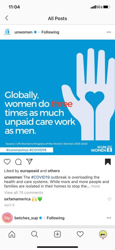 United Nation Women make an effort to bring to light to he problems specifically women face, and in this time during the pandemic. This graphic is informational too highlight the extreem gap in the amount of work men and women have to do in the care department during Covid. Women have to put themselves at risk three times more than men.