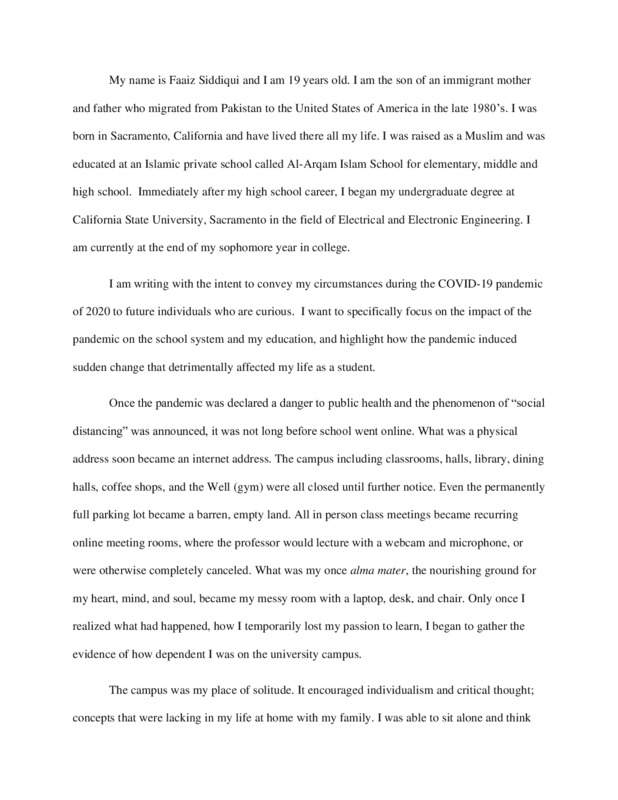 The following document is a letter to myself in the future. I am reflecting on the "new normal". I write about my experience and the growth I am experiencing during this pause in history. #CSUS #HIST15H