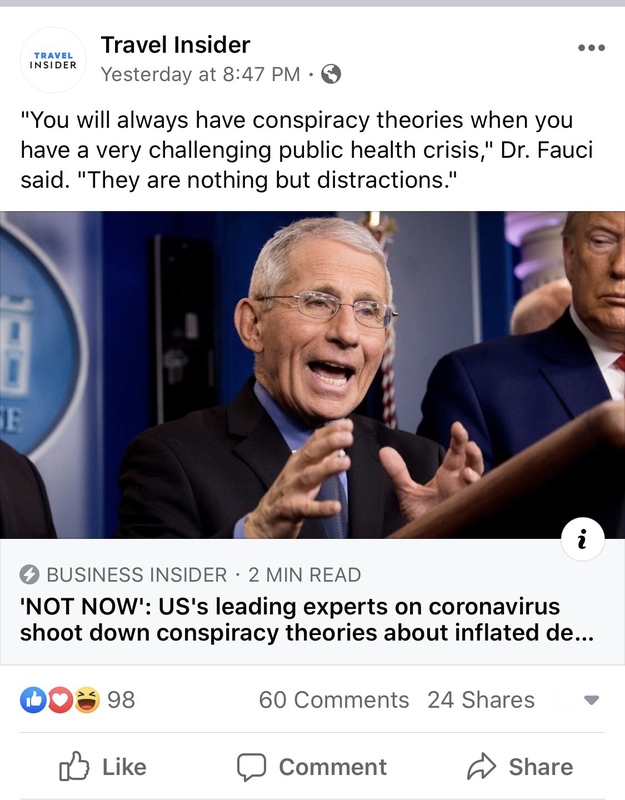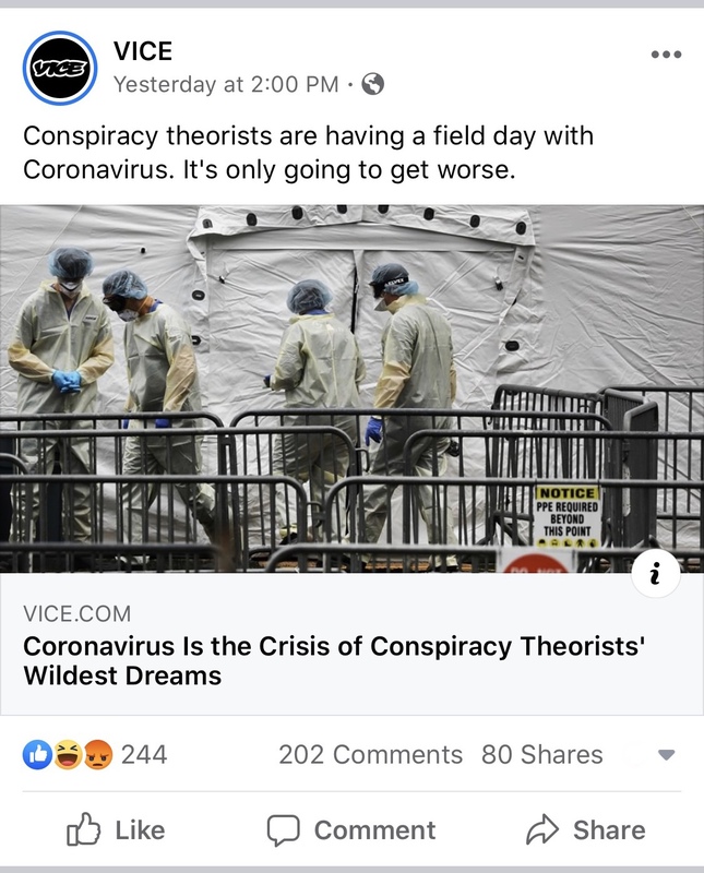This project aims to document all of the different conspiracies and their growth and treatment by the media throughout the pandemic. This is the headline of an article describing the frustration that experts have towards the conspiracy theories that are being shared