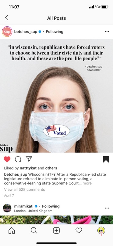 The image depicts a women with an I voted sticker on her medical mask, this is in response to Wisconsin not delaying their primary during the pandemic, forcing people to basically do everything the health experts encourage against. They had too wait in long lines, near people, in public spaces; this is basically a new form of voter supression.